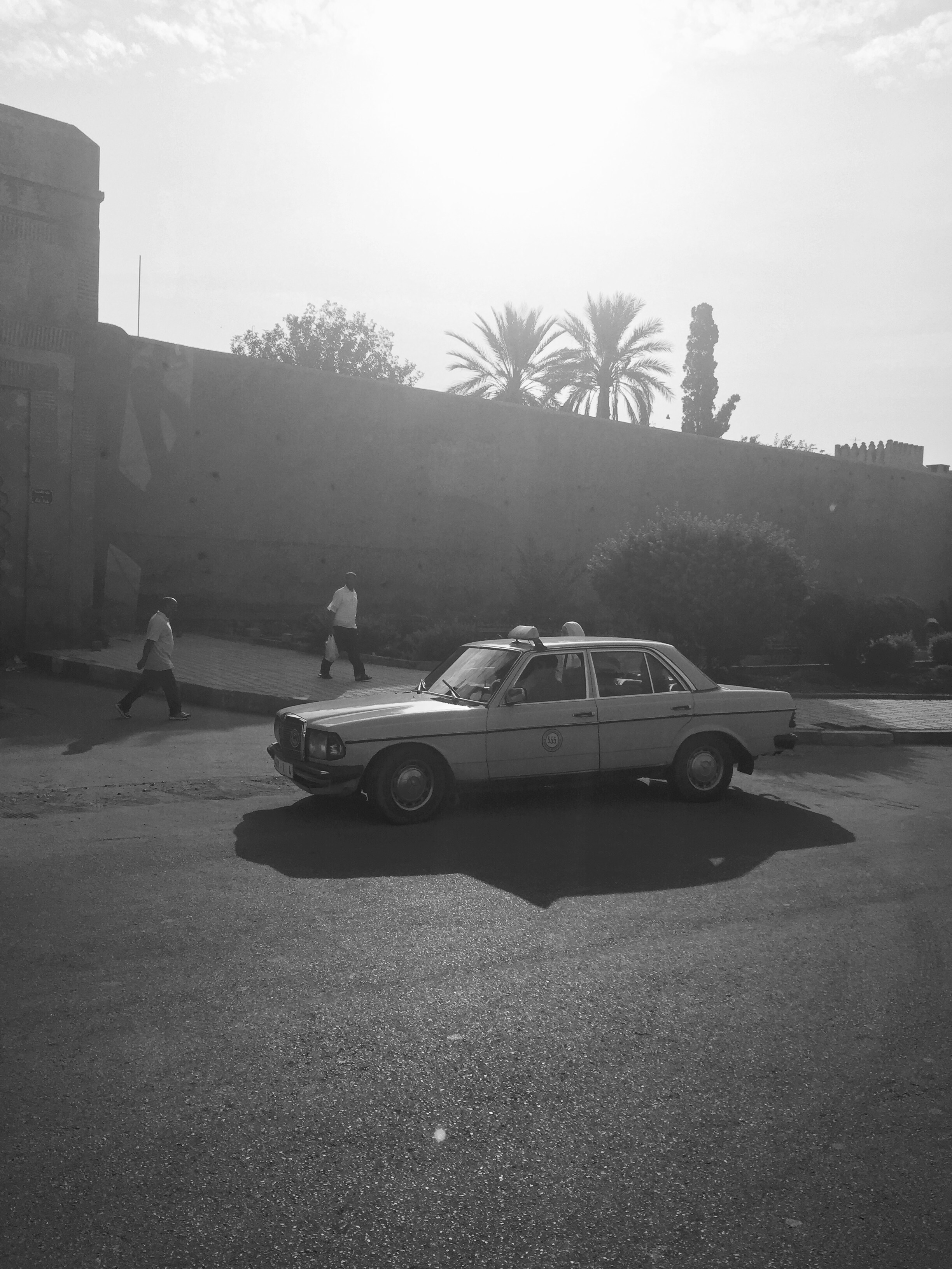 A woman hops into a grand taxi outside the Kasbah in Marrakech. Unlike the petit taxi, the grand taxi is not only useful for short trips across town, but also takes passengers on longer journeys to neighbouring cities and villages. They are often four-door Mercedes-Benz W123 sedans from the 70s and come in a washed out pastel kind of ochre colour. I am on route back from a trip to a small district in the Atlas Mountains and take the picture from the window of a moving car. Many are forced to make the one hour journey from rural to urban everyday for work. As I watch on, I can’t help but wonder where the woman is going, what her story is and whether she is travelling far.